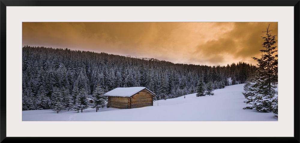 <p>Farm hut and forest in winter, dolomite mountains, Alta Badia, south Tyrol, Italy.</p>
