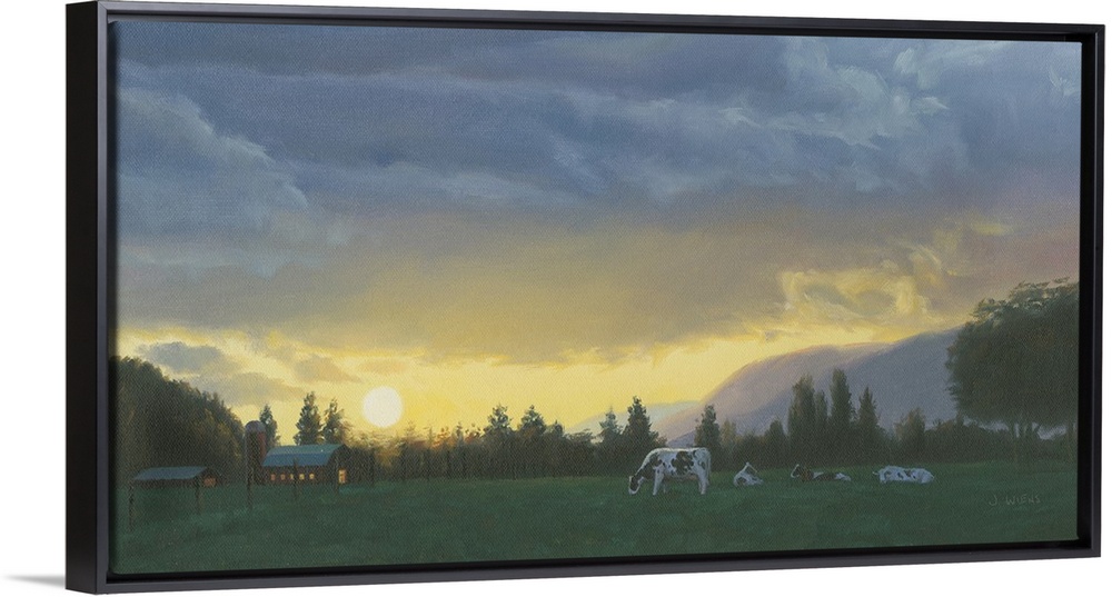<p>Large contemporary painting of cows grazing in a field at dusk with a lit up barn in the background.</p>
