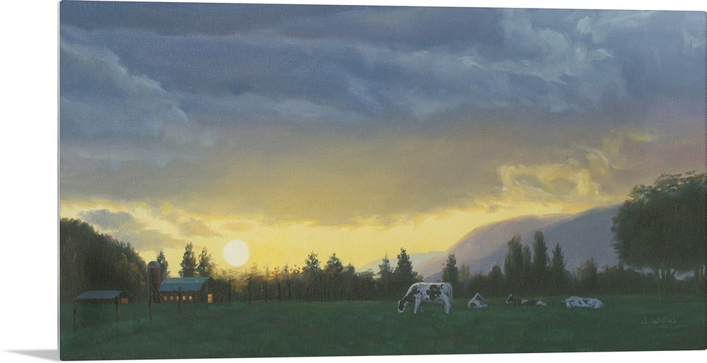 <p>Large contemporary painting of cows grazing in a field at dusk with a lit up barn in the background.</p>