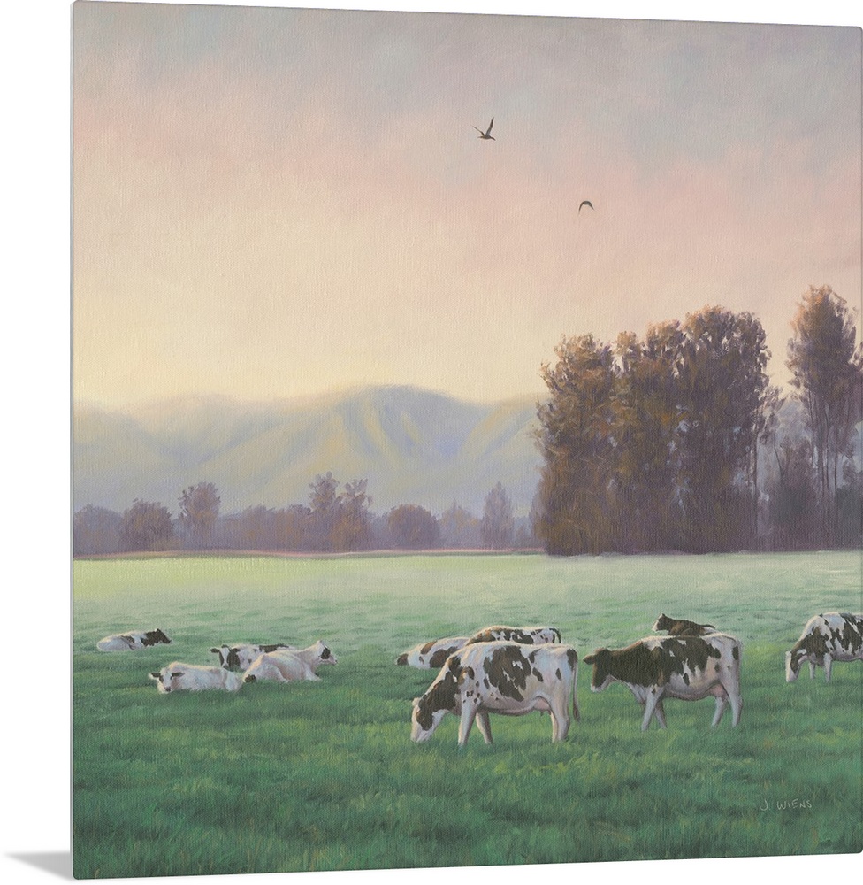 <p>Square painting of a rural farm scene with grazing cows and mountains in the background.</p>