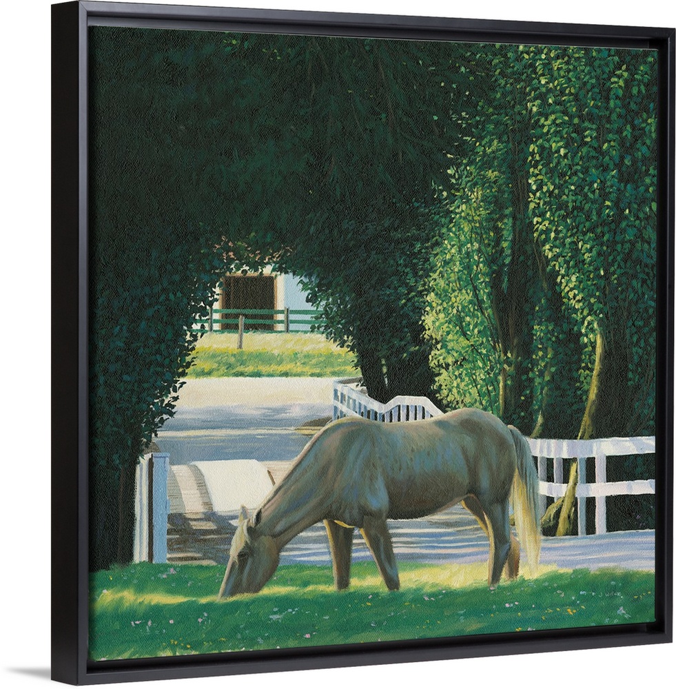 <p>Contemporary painting of a horse grazing alongside a driveway with a white picket fence and arched bushes.</p>