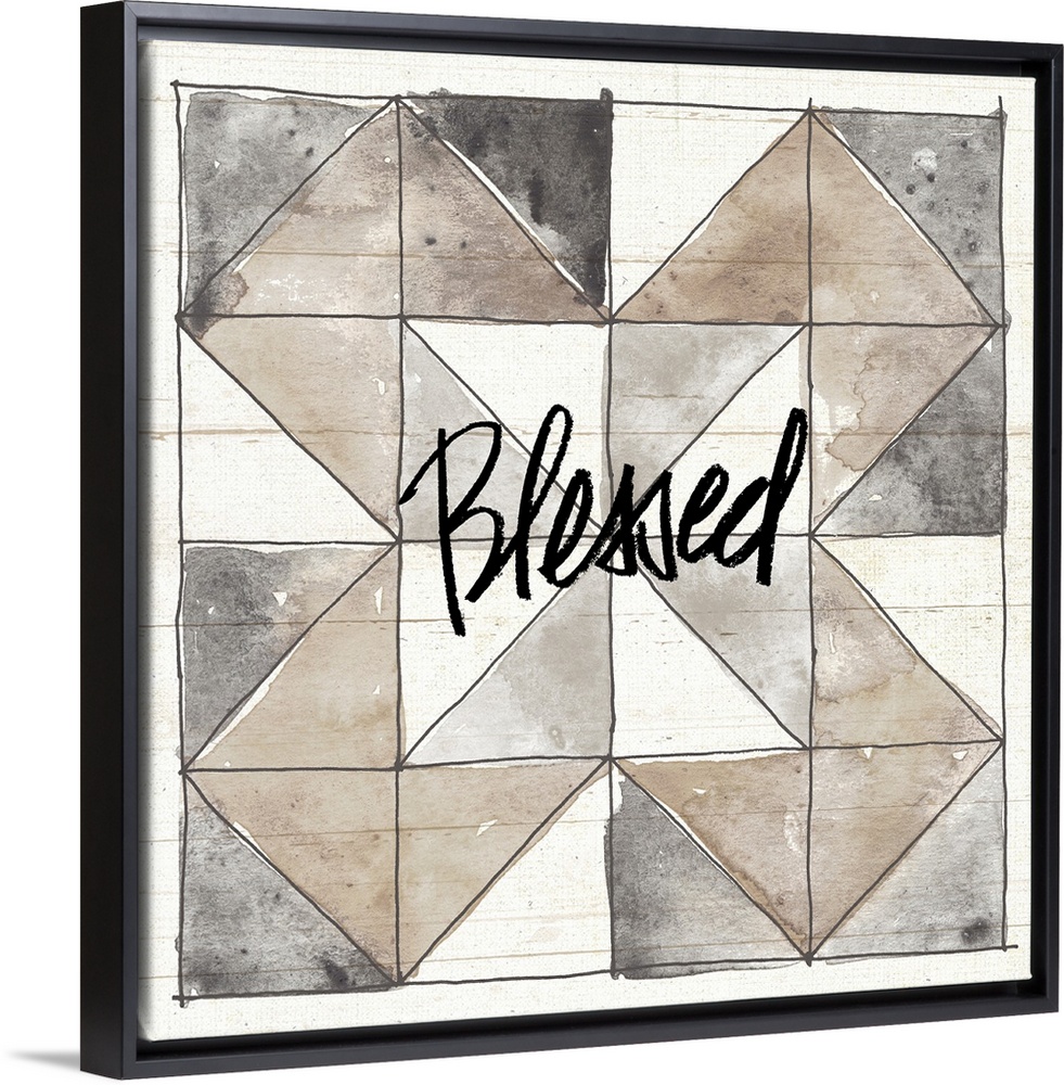 <p>"Blessed" with a watercolor quilt box design in neutral colors on a wood panel backdrop.</p>