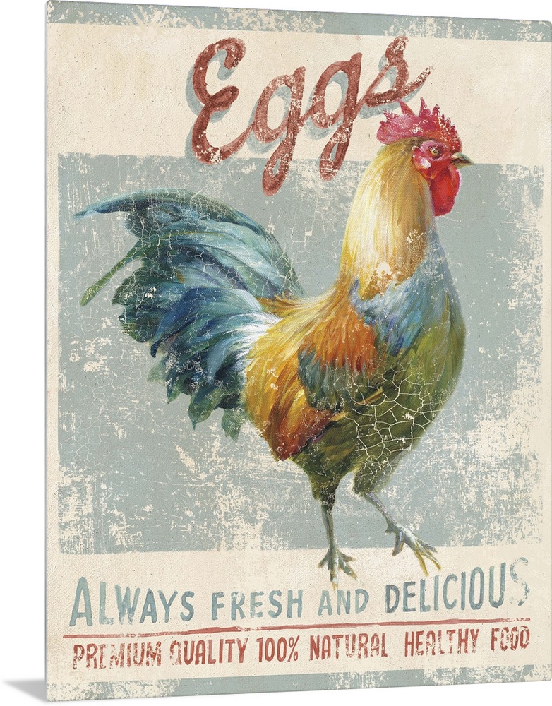 <p>Contemporary folk art decor of a rustic weathered sign for farm fresh eggs.</p>