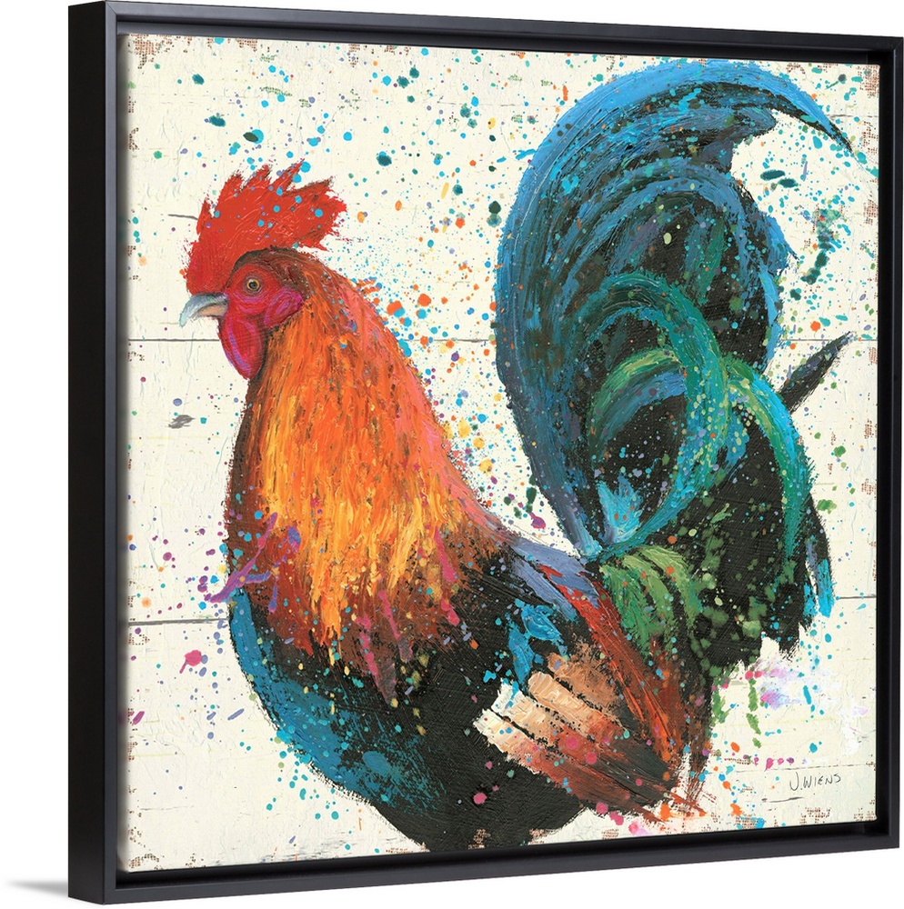 <p>Contemporary painting of a colorful rooster embellished with paint splatters.</p>