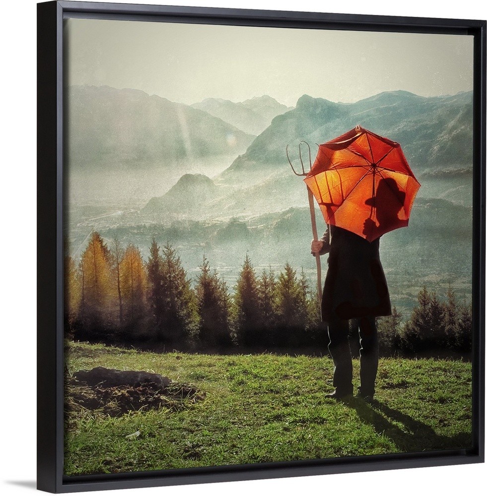 <p>A farmer with a pitchfork and an orange umbrella looking over the Swiss Alpine landscape.</p>