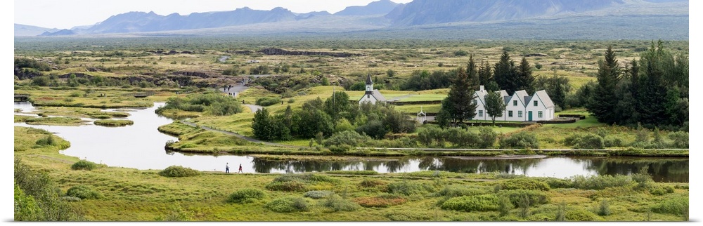 <p>Farmhouse and church by Oxara River, Pingvellir National Park, Blaskogabyggo, Iceland</p>