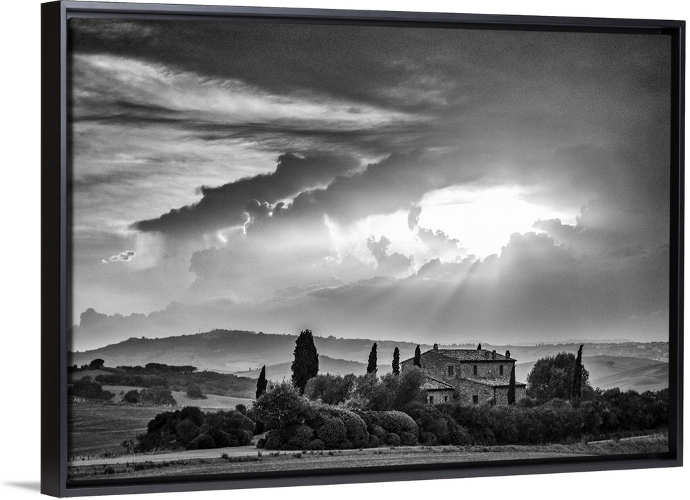 <p>Farmhouse and stormy sky, Val d'Orcia, Tuscany, Italy.</p>