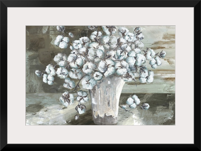 <p>A decorative painting of a vase full of white cotton balls in subdue tones.</p>