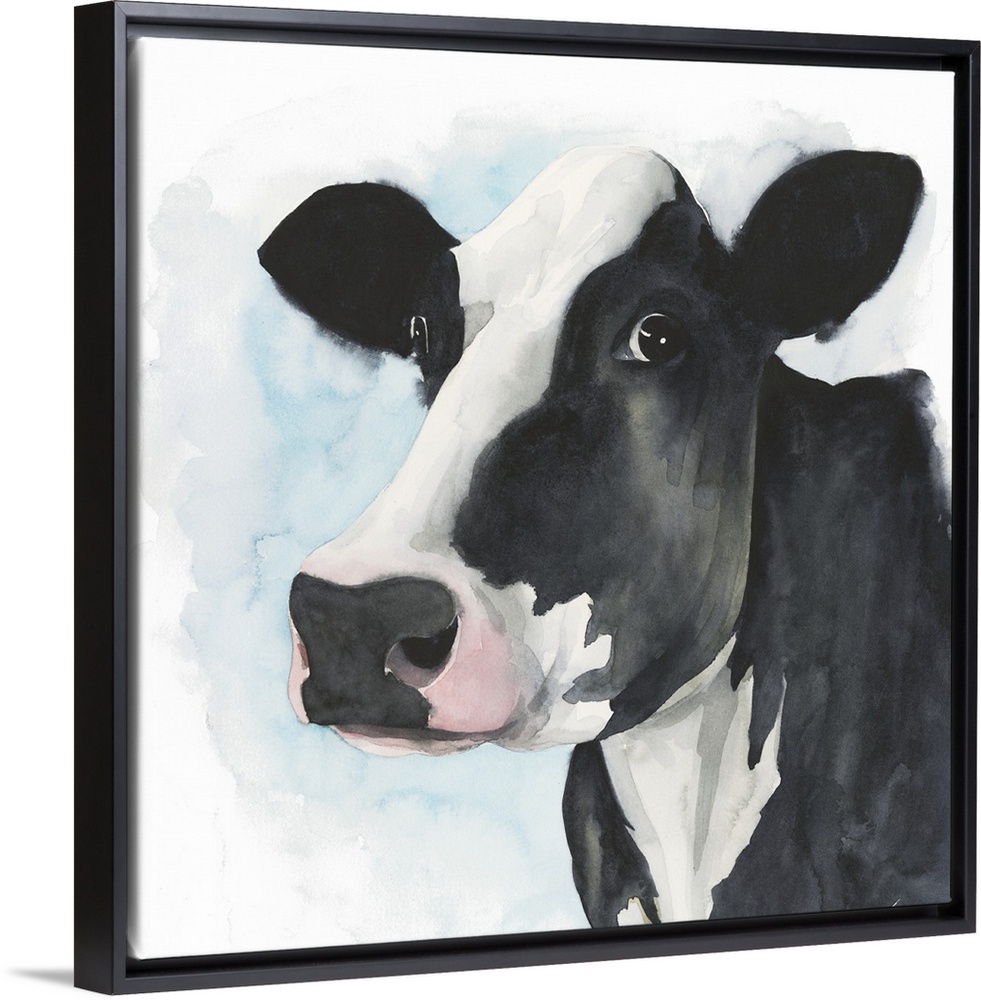 <p>A watercolor portrait of a black and white cow with pink and blue accents.</p>