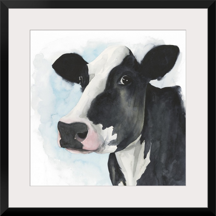 <p>A watercolor portrait of a black and white cow with pink and blue accents.</p>