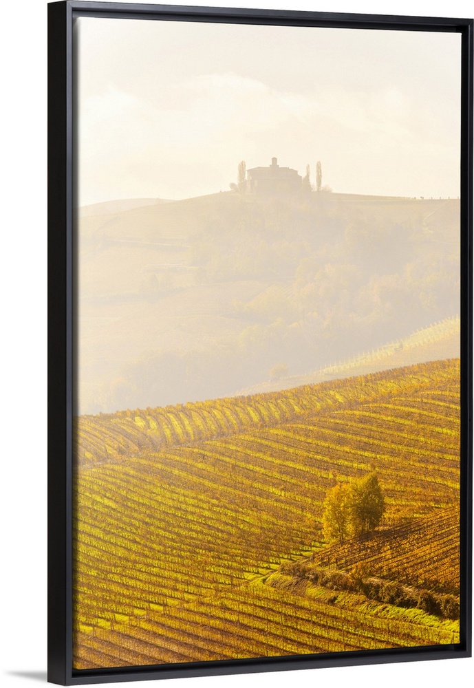 <p>Farmhouse in the fog with autumn colors in the vineyards. La Morra, Barolo wine region, Langhe, Piedmont, Italy, Europe.</p>