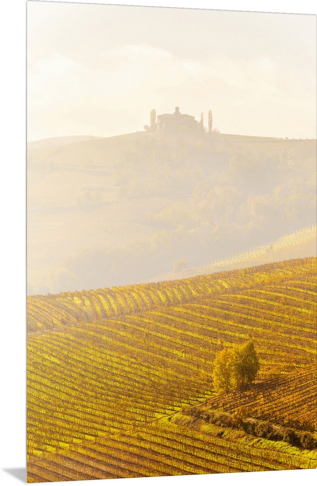 <p>Farmhouse in the fog with autumn colors in the vineyards. La Morra, Barolo wine region, Langhe, Piedmont, Italy, Europe.</p>