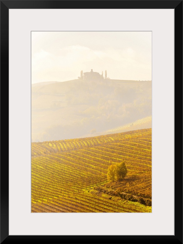 <p>Farmhouse in the fog with autumn colors in the vineyards. La Morra, Barolo wine region, Langhe, Piedmont, Italy, Europe.</p>