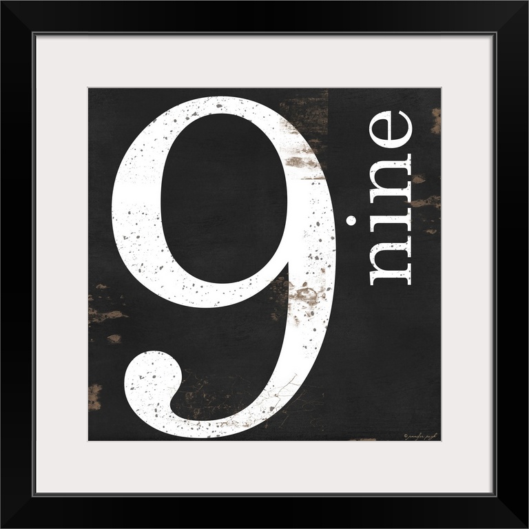 <p>Graphic art with the number nine bold and large in the center, and the word nine written smaller, vertically next to it, on a textured background of thick horizontal stripes in neutral tones.</p>