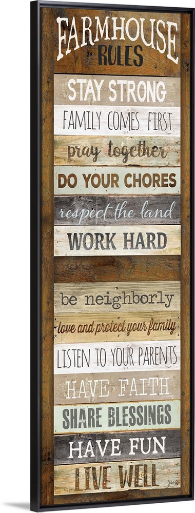 <p>Typography art of a list of farmhouse "Rules" such as doing chores and having fun, with the semblance of being painted on an old window shutter.</p>