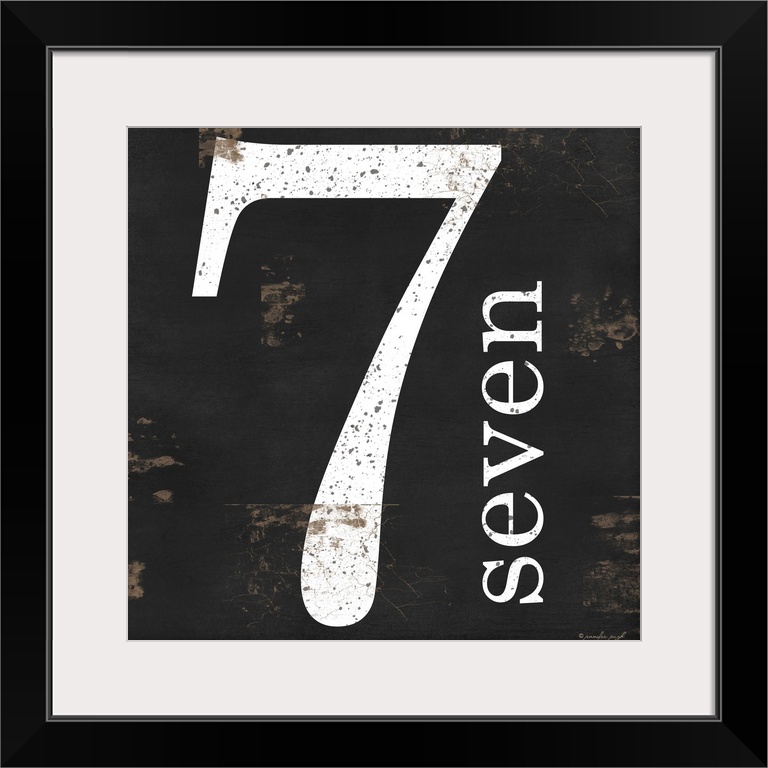<p>Graphic art with the number seven bold and large in the center, and the word seven written smaller, vertically next to it, on a textured background of thick horizontal stripes in neutral tones.</p>