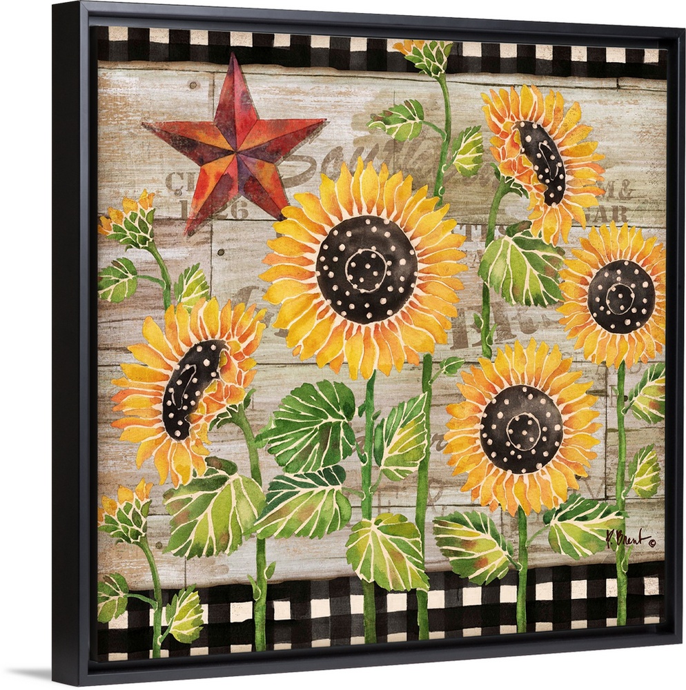 <p>Square decor with painted sunflowers on a faux wood background with a black and white checkered pattern and a red barnstar.</p>