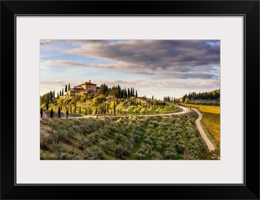 <p>Farmhouse Surrounded By Vineyards At Sunrise. Gaiole In Chianti, Siena Province, Tuscany, Italy.</p>