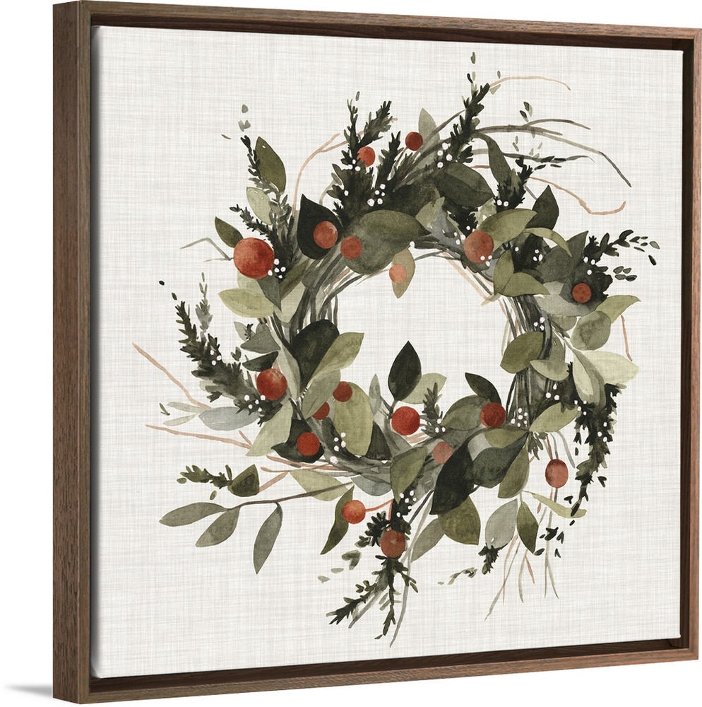 <p>A decorative farmhouse wreath of holiday greenery and berries on a linen background.</p>