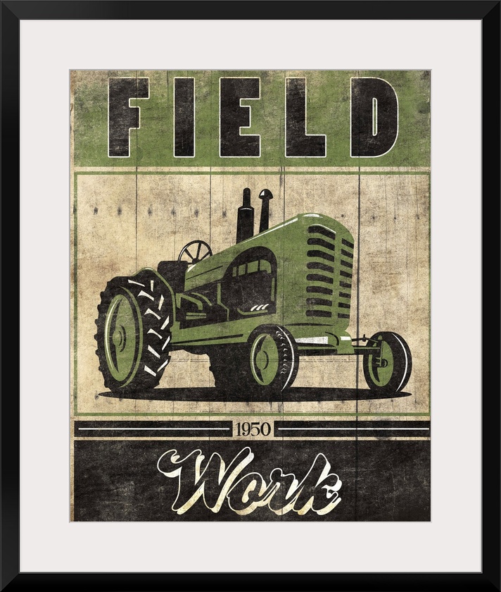 <p>Vintage weathered, rustic looking sign, with a green tractor and the text "Field" above it.</p>
