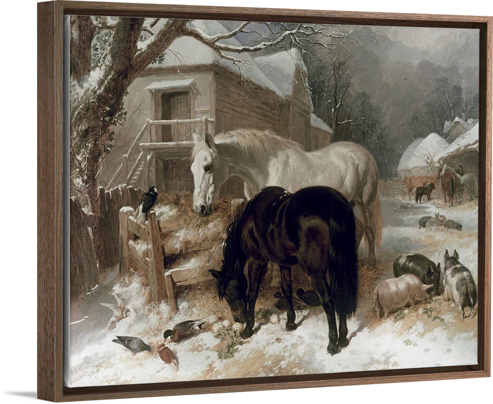 <p>Landscape artwork on a large wall hanging of a snow covered farmyard with several small buildings, and various animals grazing throughout. In the foreground, two horses, several pigs and birds help themselves to some food.</p>