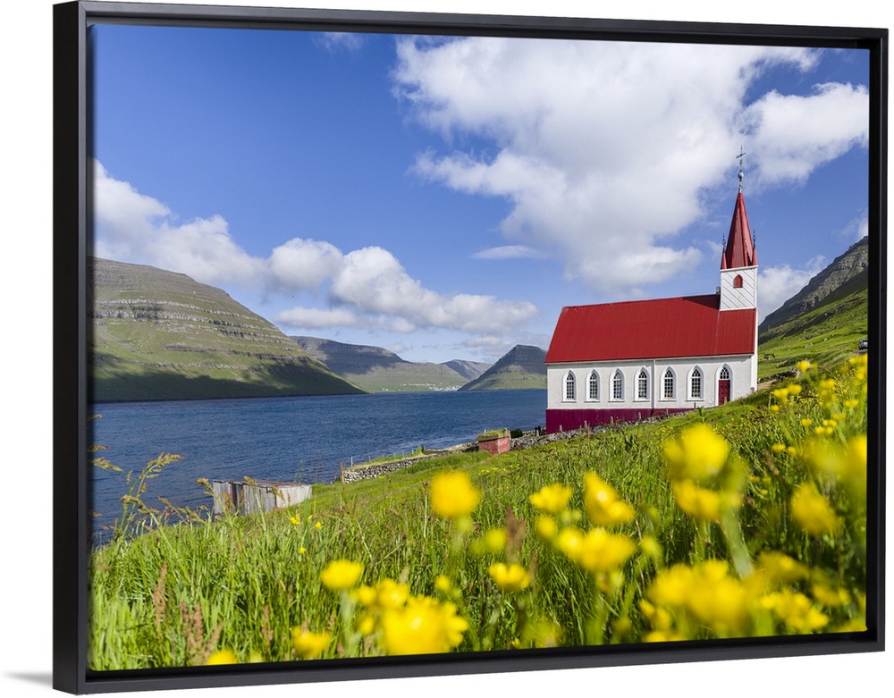 <p>The church in village Husar on Kalsoy, in the background the island of Bordoy and Klaksvik. Nordoyggjar (Northern Isles) in the Faroe Islands, an archipelago in the north atlantic. Europe, Northern Europe, Scandinavia, Denmark, Faroe Islands.</p>