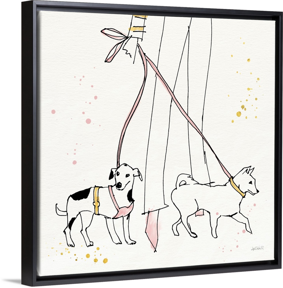 <p>Decorative artwork of a woman walking two small dogs in pink. gold, and white.</p>