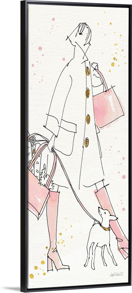 <p>Watercolor painting of a stylish woman alongside a dog with pink and gold accents.</p>