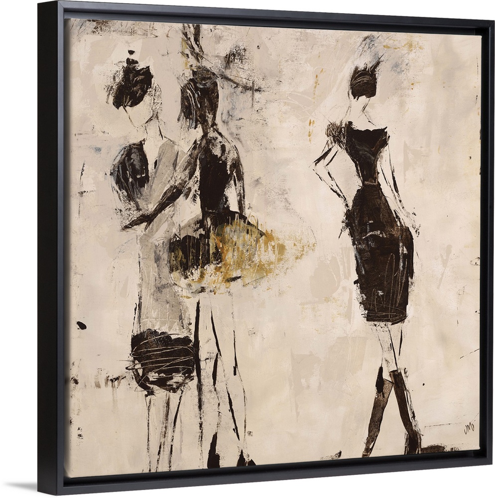 <p>Contemporary painting of three very thin looking female figures in fashionable clothing.</p>