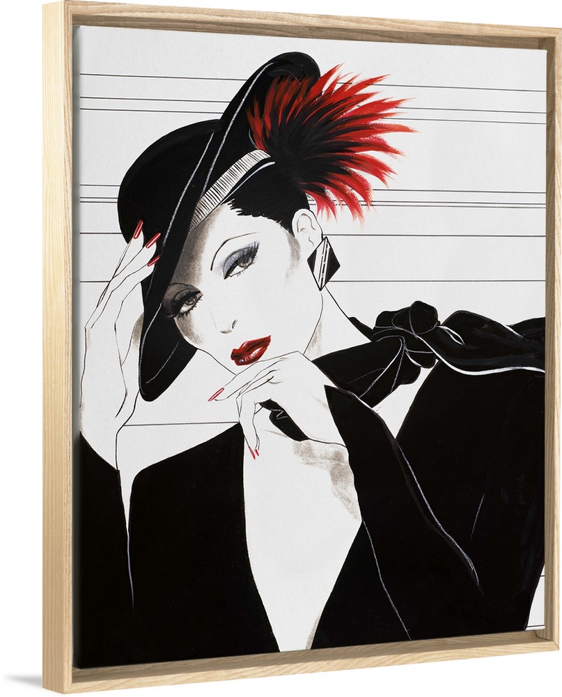 <p>Fashion artwork of a woman wearing all black and black hat with a bright red feather in it.</p>