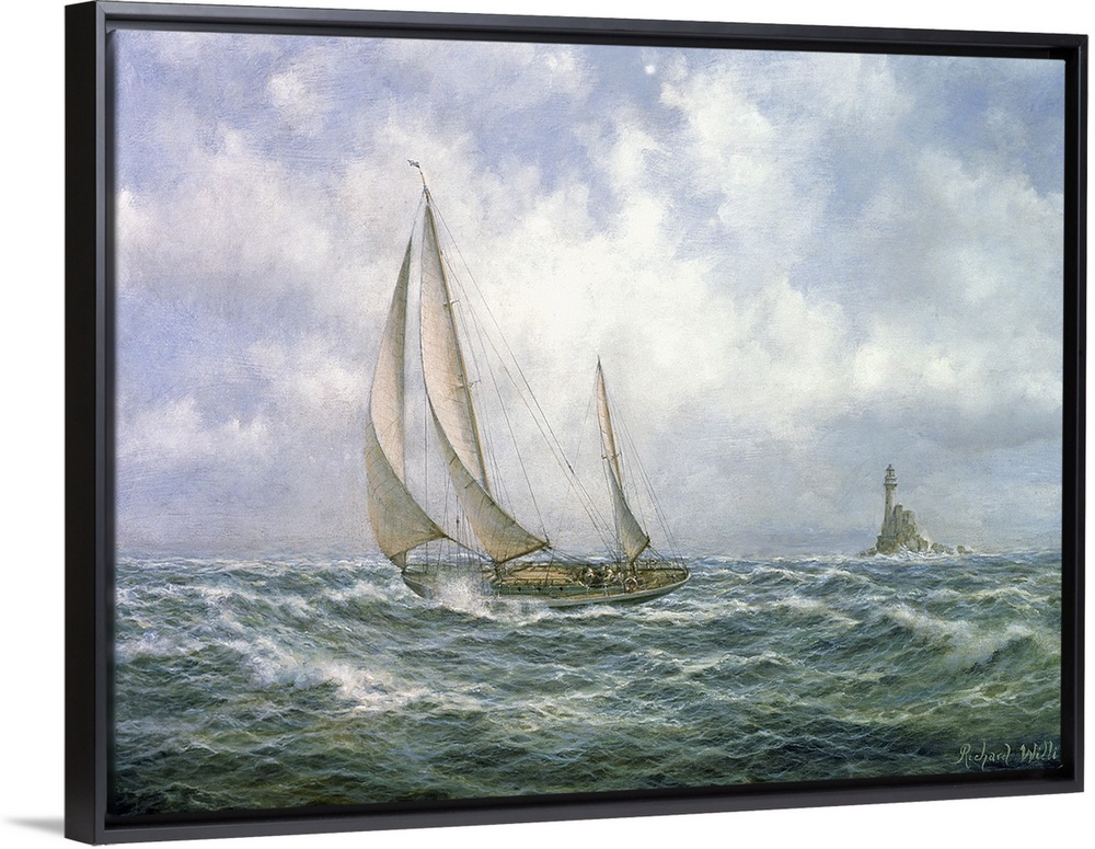 <p>A large artwork piece of a sailboat in rough waters with a cloudy sky behind it and a lighthouse in the distance.</p>