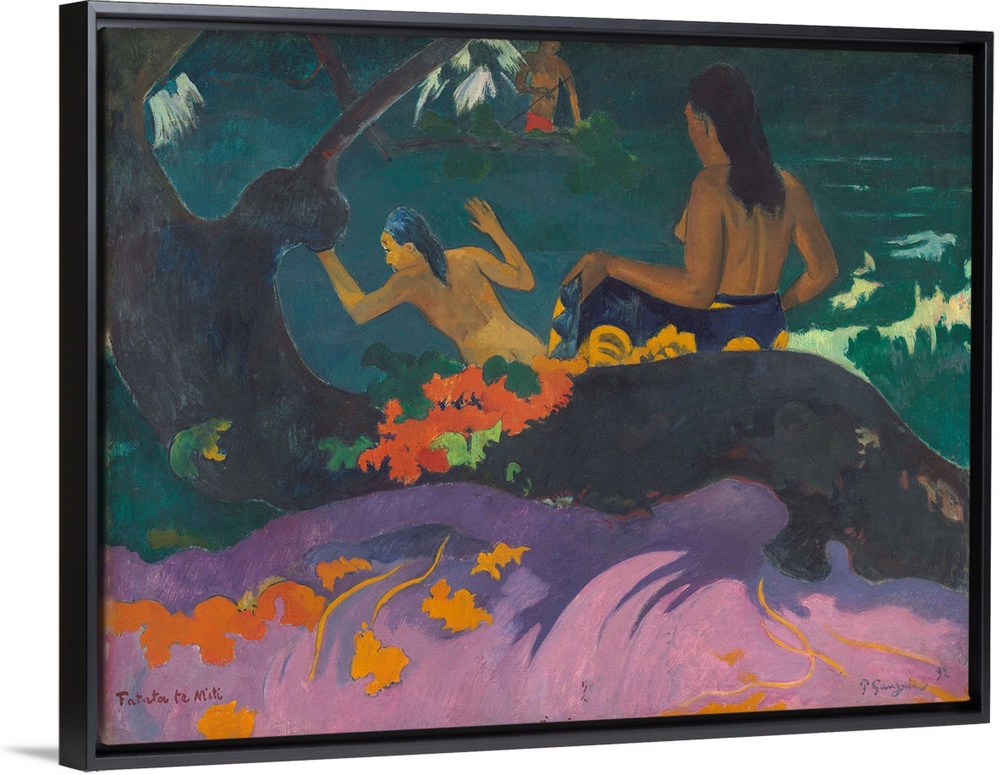 <p>Fatata te Miti (By the Sea), by Paul Gauguin, 1892, French Post-Impressionist painting, oil on canvas. Painted during Gauguin's first trip to Tahiti, it depicts a woman removing her pareo to join a companion who is plunging into the sea for a swim. Nearby</p>