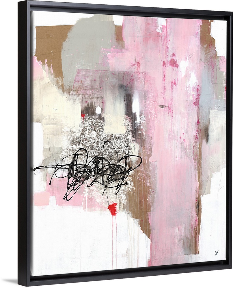<p>Contemporary abstract painting with pink, gray, tan, and beige brushstrokes, and a black scribble line design over a white sponge-like texture.</p>