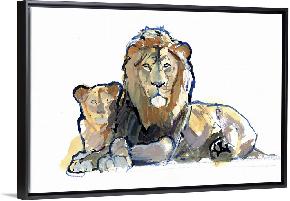 <p>Contemporary painting of a lion and his cub with indigo outlines on a white background.</p>