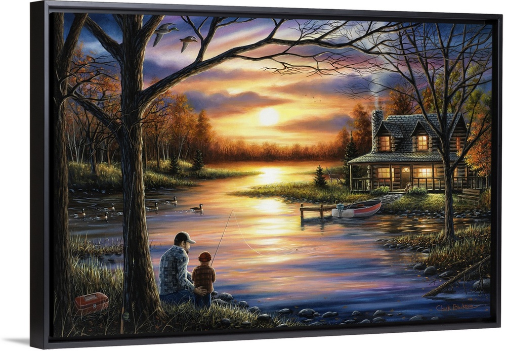 <p>Contemporary landscape painting of a father and sun fishing at sunset with a cabin in the background.</p>