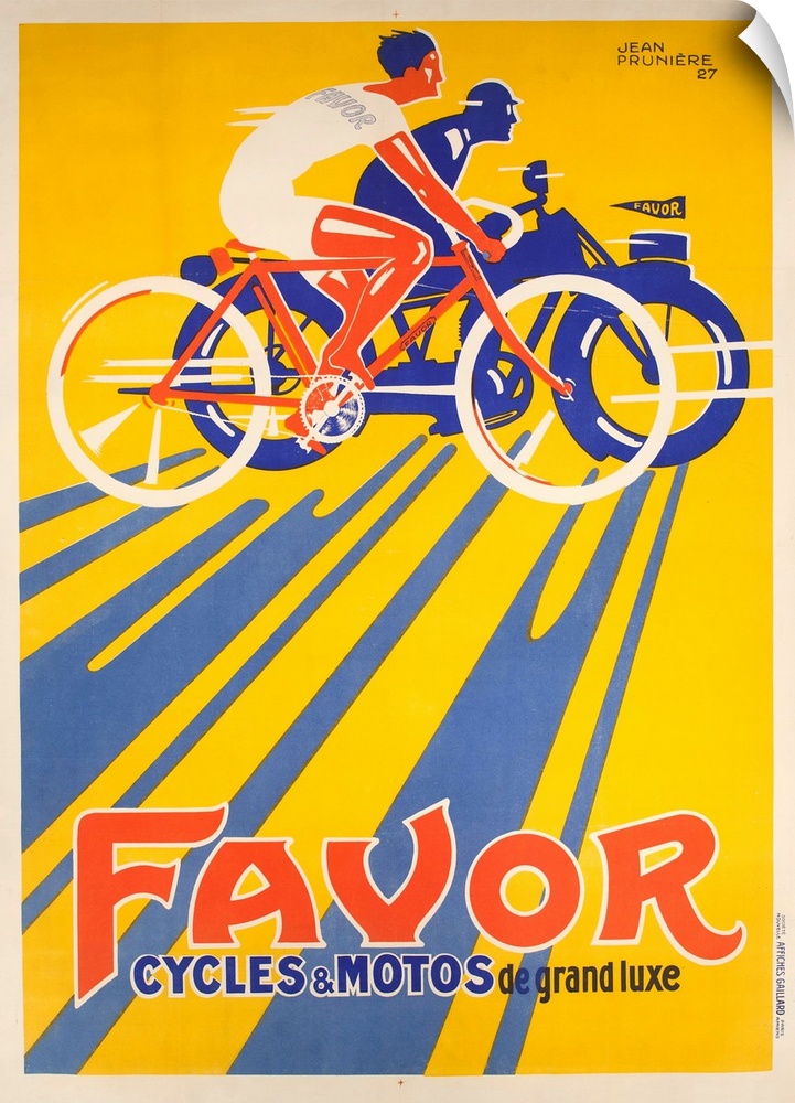<p>1927 Franch advertising poster illustrated by Jean Pruniere. Bicyclist and motorcycle rider ride side by side</p>