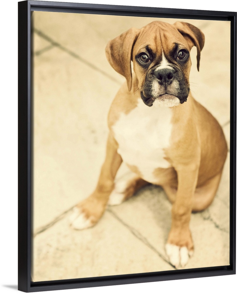 <p>Clyde- fawn boxer puppy sitting on floor.</p>