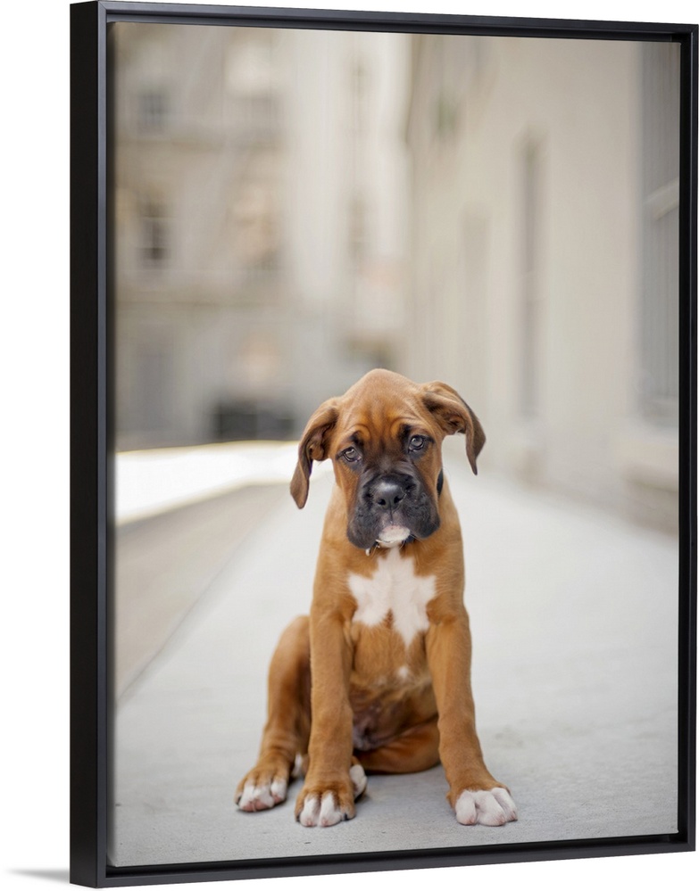 <p>Fawn colored boxer puppy with black face and white markings standing in alley. 2 months old looking at camera, sadly.</p>