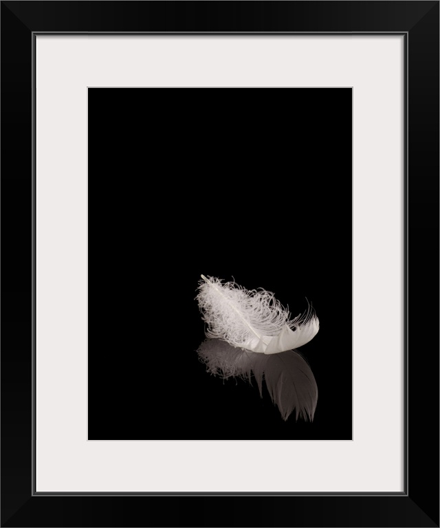 <p>White feather on black reflective surface.</p>