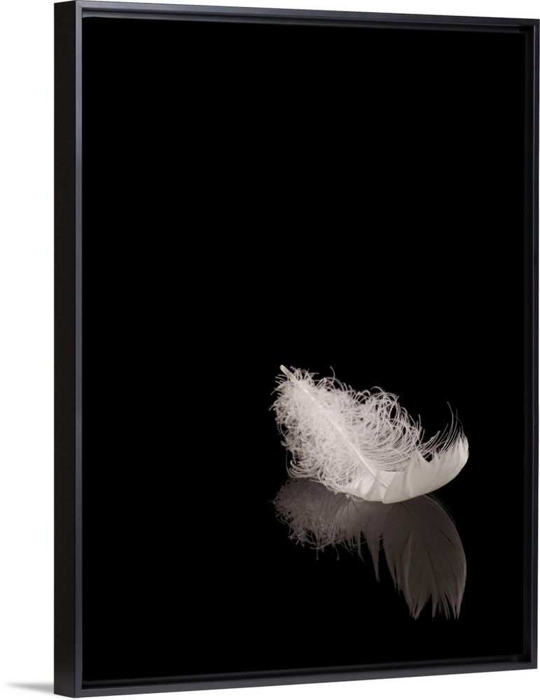 <p>White feather on black reflective surface.</p>