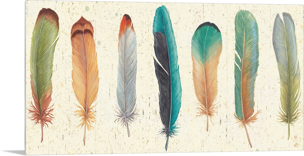 <p>Contemporary artwork of several colorful feathers in a row on a beige background.</p>
