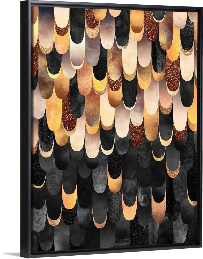 <p>Overlapping scales in shades of copper, rose gold, grey and black form a feather design</p>