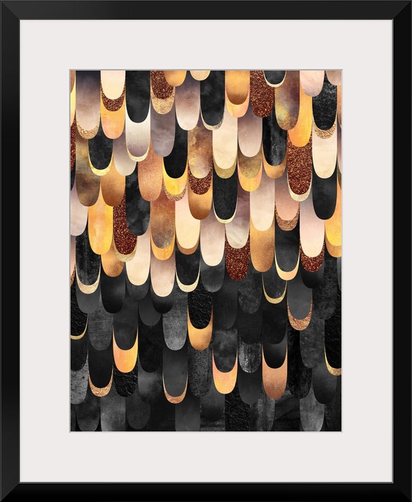 <p>Overlapping scales in shades of copper, rose gold, grey and black form a feather design</p>
