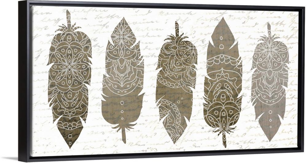 <p>A row of five silver feathers with white Bohemian patterns.</p>