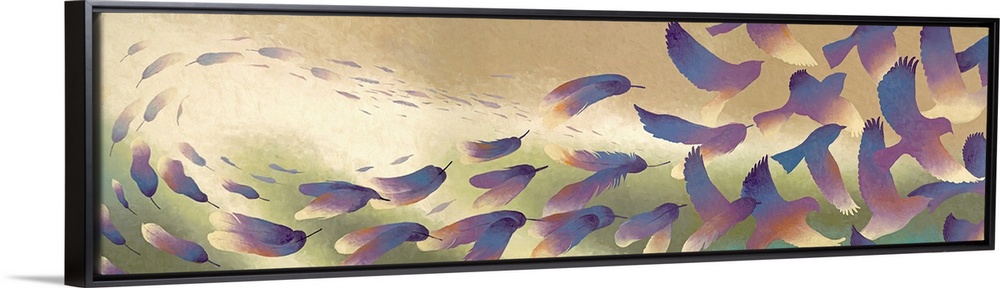 <p>A wide, contemporary wildlife painting by Patrick Howe featuring a swirl of feathers transforming into to birds.</p>