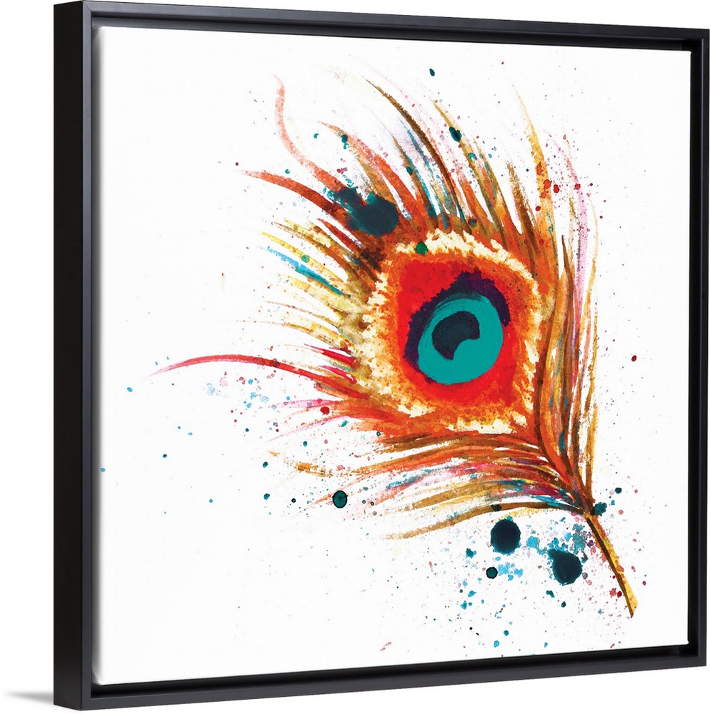 <p>Contemporary artwork of a brightly colored peacock feather with paint splatters.</p>
