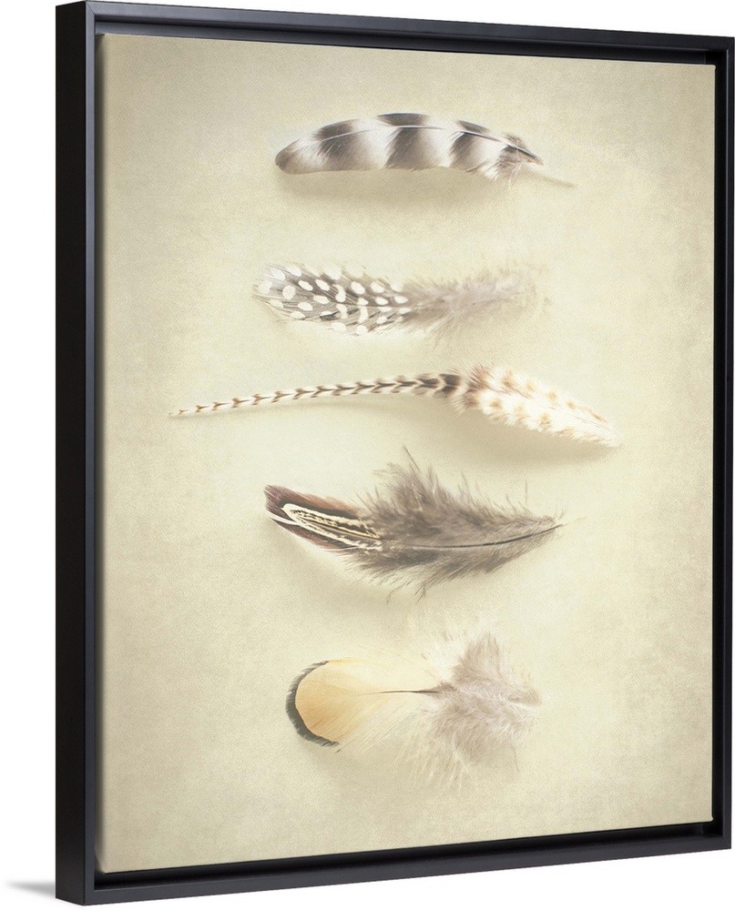 <p>A rustic photograph of various feathers against a beige background.</p>