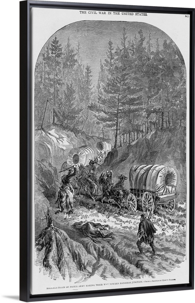 <p>Soldiers whip mules into even greater efforts as a Union baggage train makes its way toward Manassas Junction, Virginia.</p>