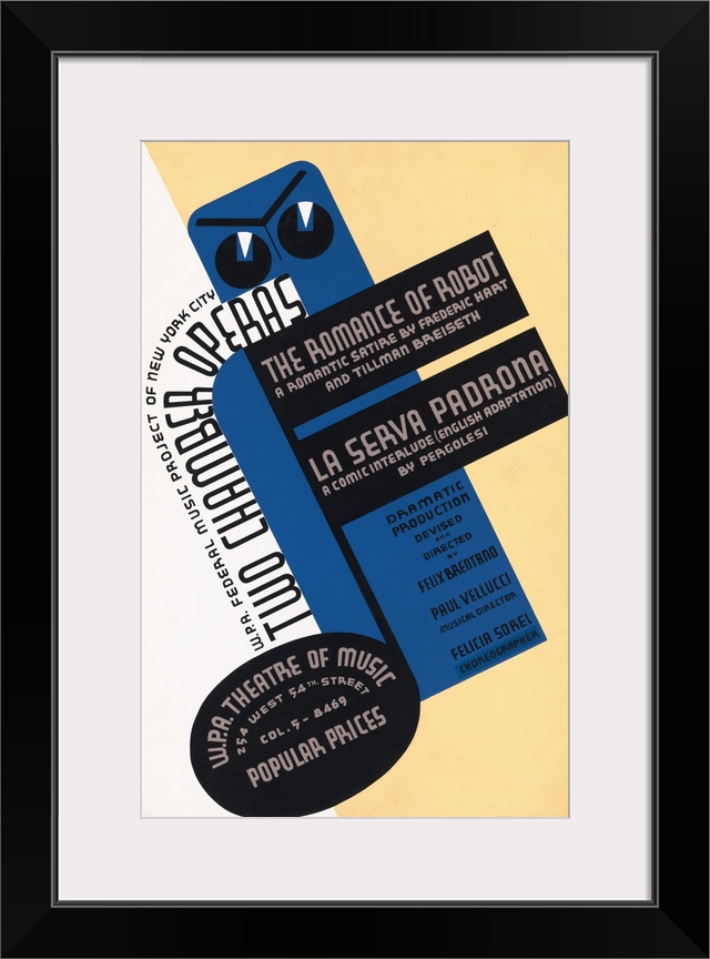 <p>W.P.A. Federal Music Project of New York City presents two chamber operas, The Romance of Robot and La Serva Padrona. Poster for Federal Music Project presentation of The Romance of Robot a romantic satire by Frederic Hart and Tillman Breiseth, and La Serva Padrona a comic interlude by Pergolesi; dramatic production devised and directed by Felix Brentano, with Paul Vellucci, music director, and Felicia Sorel, choreographer, at the W.P.A. Theatre of Music, 254 West 54th Street, New York City. Library of Congress, Prints and Photographs Division, WPA Poster Collection.</p>