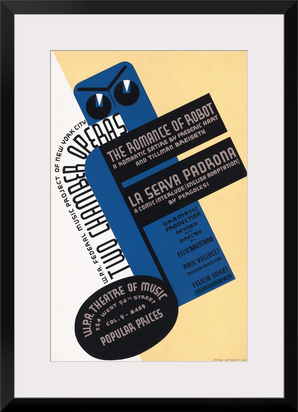 <p>W.P.A. Federal Music Project of New York City presents two chamber operas, The Romance of Robot and La Serva Padrona. Poster for Federal Music Project presentation of The Romance of Robot a romantic satire by Frederic Hart and Tillman Breiseth, and La Serva Padrona a comic interlude by Pergolesi; dramatic production devised and directed by Felix Brentano, with Paul Vellucci, music director, and Felicia Sorel, choreographer, at the W.P.A. Theatre of Music, 254 West 54th Street, New York City. Library of Congress, Prints and Photographs Division, WPA Poster Collection.</p>